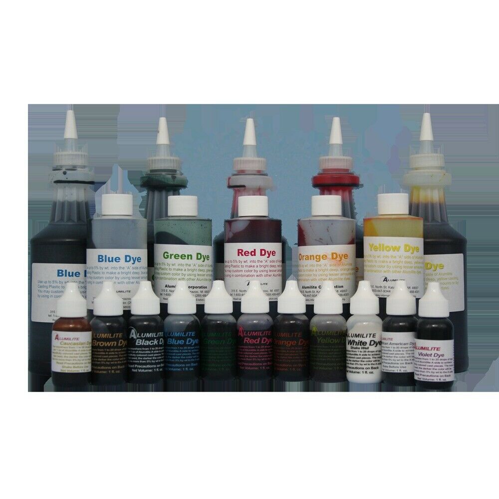 Alumilite Dye Use Alumilites Dyes to color your casting resin. Can be used in the water clear resin to make a translucent colored casting. The dyes are added to the A side by weight up to 5%. Use the Flesh tones according to your preference of shade (flesh tones are typically used in Alumilite White to achieve the best results). NOTE: 1 oz. bottle dispensing tip must be cut to dispense dye. Tip may also be removed completely.