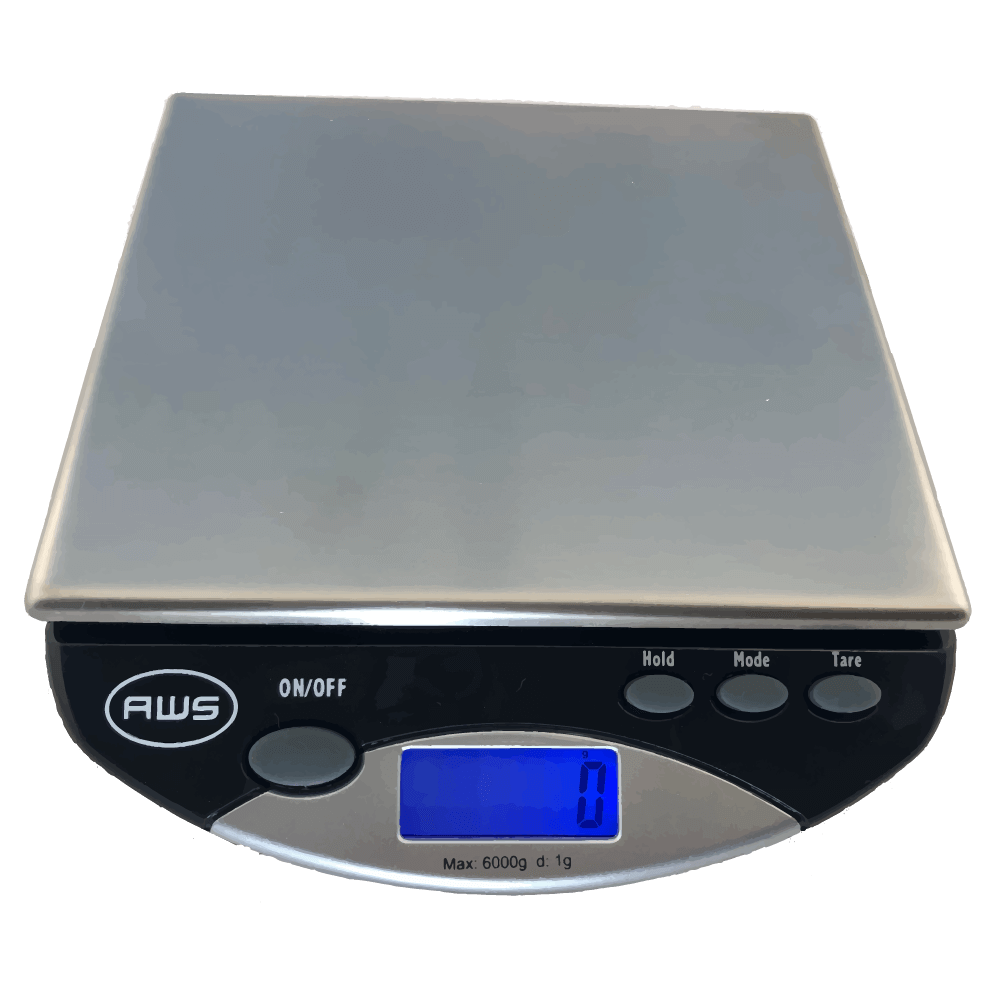 Gram Scale with a 6000 gram (13.2 lb.) capacity and measures in 1 gram/0.1 oz graduation. Back-lit LCD display with optional auto shutoff function. Measures in g, kg, oz, or lbs. 9 volt battery included.