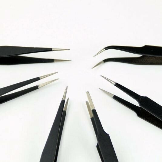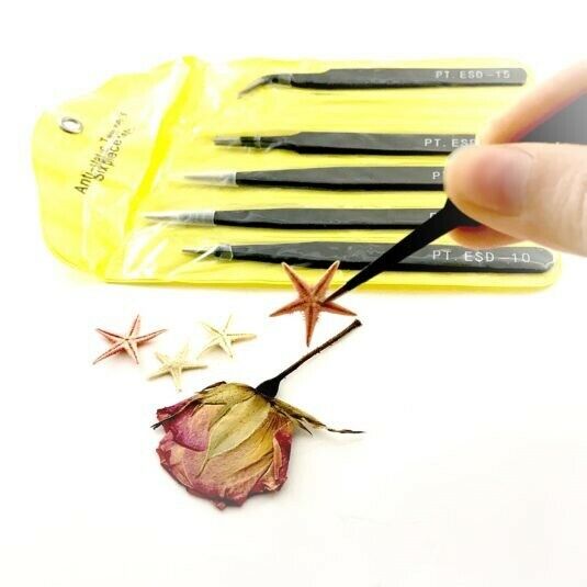 6pcs Art & Craft BGA Precision Tweezer Set Antistatic Tweezers Stainless Tweezers! Good To Use With A Fragile Flower, Feather And So On! Features: 100% brand new,high quality Model: ESD-10/11/12/13/14/15 Material: stainless steel Surface treatment: processed in high temperature and planting antistatic material Type of tip: pointed and curved Package including : 1x6pcs BGA Precision Tweezer Set Antistatic Tweezers Stainless Tweezers
